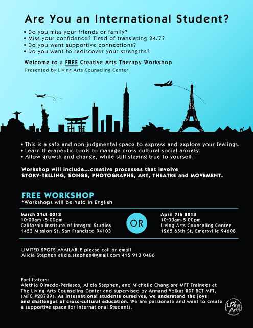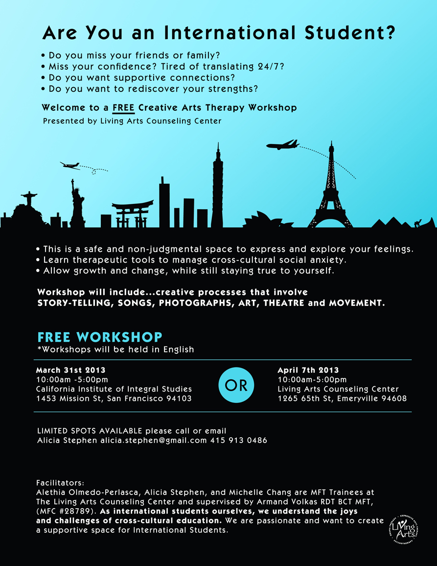 LOCATION:March 31: California Institute of Integral Studies 1453 Mission Street, San Francisco, CA 94103/April 7: Living Arts Counseling Center 1265 65th Street, Emeryville, CA 94608